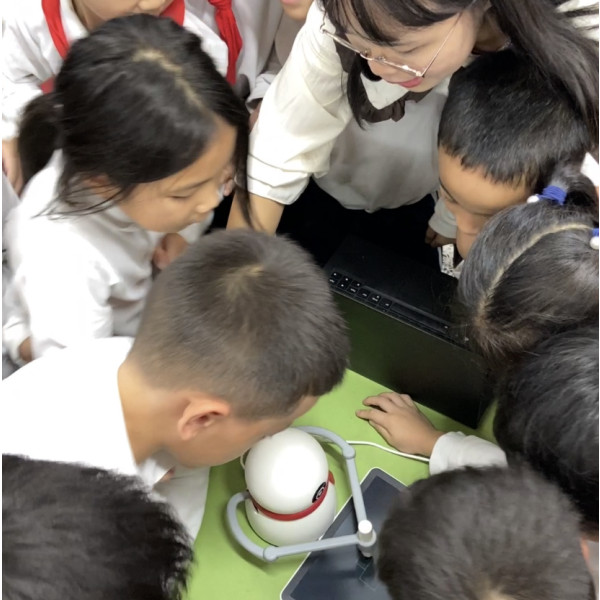 虞叔叔通過圖片、視頻,結合自身智能制造經歷例舉給同學們仔細講解機器人誕生的過程,引發了孩子們的好奇以及思考。